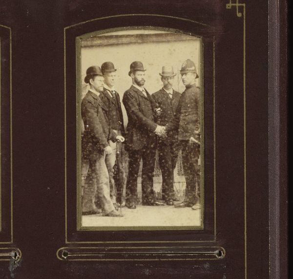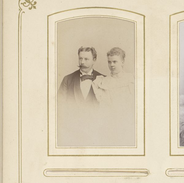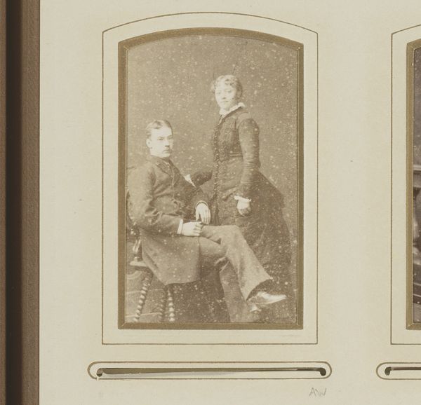 Carl Borntraeger created this small photographic print, “Portret van een vrouw en man in treinwagon”, using the wet collodion process. The image is mounted onto card stock and housed within an oval frame, itself suggestive of painted portrait miniatures, while also capturing a decisive moment in the history of transportation. The wet collodion process involved coating a glass plate with chemicals, exposing it in a camera while still wet, and then developing the image immediately. This required skill and speed, but it allowed photographers to produce detailed images on glass negatives. The sepia tone results from the chemical development, lending the photo a nostalgic, timeless quality. The subjects, dressed in their finery, appear self-conscious in this new kind of mobile space. This is a reminder that photography, like the railways themselves, was once a cutting-edge technology reshaping social life and our perception of time and space. Examining the material and its process helps us appreciate how even seemingly straightforward images are deeply embedded in technology, labor, and society.