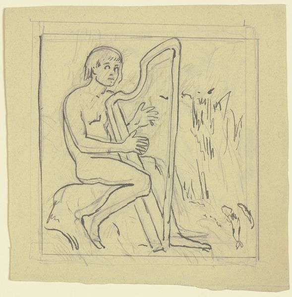 This is Hans Thoma’s “Jüngling mit Harfe (Kachelentwurf)”, or “Young Man with Harp (Tile Design)”. Thoma lived through a period of significant social change, witnessing the unification of Germany and the rise of industrialization. His artistic style often reflects a longing for an idealized, pre-industrial past. In this sketch, we see a nude young man with a harp, an image that evokes classical antiquity and perhaps the figure of Apollo, god of music and poetry. But Thoma gives us an androgynous figure, blurring traditional gender lines. We might ask, how does this resonate with shifting ideas about sexuality and identity during the late 19th and early 20th centuries? Thoma once said, "Art should ennoble man and give him courage." This tile design is a study in idealized beauty, but it also prompts us to reflect on how such ideals are constructed and who they include or exclude. It remains a poignant expression of both longing and hope.