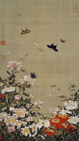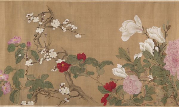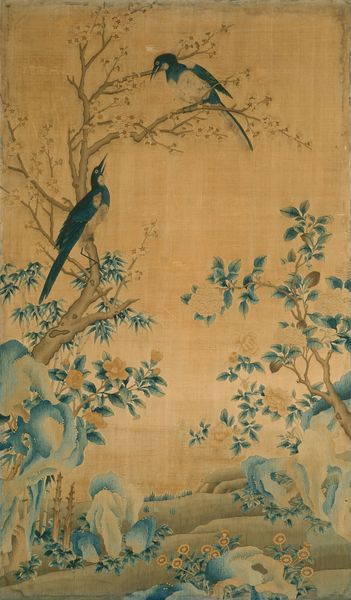 This is a scroll painting entitled "Flowering Shrubs and Field Sparrows (?)", by Hasegawa Gyokuho, made sometime in the 19th century, likely with ink and color on silk. The vertical composition of the scroll is immediately striking. Note how the artist balances the visual weight between the upper and lower portions of the painting. The flowering shrubs create a delicate, almost ethereal quality, contrasted by the more solid presence of the field sparrows. Gyokuho's use of empty space, or 'ma,' is not merely a void but an active element that enhances the composition. The negative space allows the viewer's eye to move freely, encouraging contemplation and a sense of harmony. The strategic placement of the birds and the directional flow of the branches, construct the overall balance of the composition, drawing us into a deeper engagement with its underlying structure. Each element, from the subtle gradations of color to the precise rendering of form, contributes to a visual and intellectual experience. This invites us to consider the relationships between nature, representation, and perception.