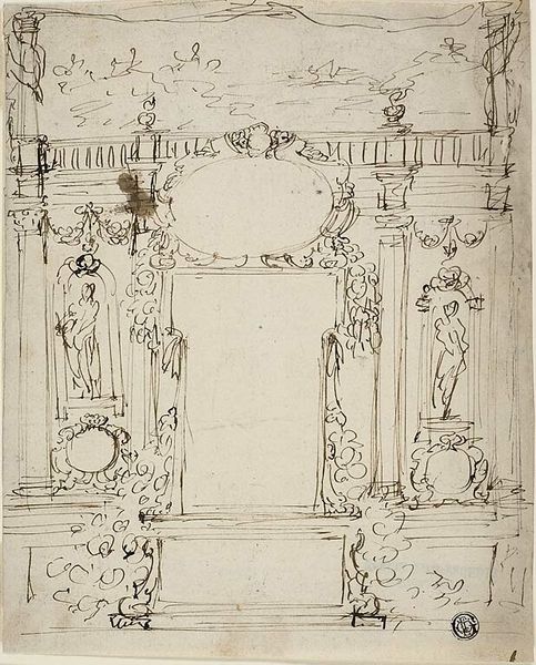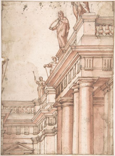 Curator: "Corner of a Loggia with Female Statue" by Pietro Righini. It's rendered in ink, graphite, and chalk on paper. It feels like a stage set. So contained and considered. What jumps out to you? Editor: Well, initially, the technique is what grabs me, it’s so detailed. It looks like something lifted from a Renaissance architectural treatise. How do you interpret it? What should we be paying close attention to? Curator: Notice how Righini has lavished such precise, painstaking labor onto rendering what is, essentially, a fragment. Think about the raw materials. The sourcing, preparation, and transformation of chalk, graphite, and ink into this representational form required dedicated workshops and specialized skills. What does it signify, this investment in recreating elite spaces with such "humble" material? Editor: Are you suggesting the act of drawing elevates these spaces? It immortalizes architecture and this particular classical style, even if only on paper. The artistic labour involved renders them accessible, turning this elite architecture into a commodity? Curator: Precisely! This drawing acts as both document and aspirational object. It represents classical ideals, making them available for study, emulation and, yes, consumption, potentially inspiring other artists to further transform its aesthetic into everyday objects. Can you imagine where this drawing might fit into a larger system of production and value? Editor: I suppose it would serve as a template, ready for translation into paintings, engravings or even smaller decorative arts for those seeking to align themselves with that upper-class taste, classical learning… fascinating. Thanks. Curator: Indeed! Reflecting on the artist's work and social contexts through these media helps us understand cultural and economic production and consumption, doesn't it?