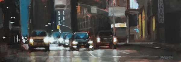 Jeff Jamison's oil on canvas, "New York Times," captures the city's pulse through a sun-drenched urban scene. The light here isn't just illumination; it's a symbolic force, reminiscent of religious paintings where divine light signifies revelation. Consider the sun: In ancient Egyptian art, Ra, the sun god, symbolized power and rebirth. Here, the light transforms the mundane into something transcendent, echoing the city’s ceaseless energy. The figures crossing the street, rendered with gestural brushstrokes, appear like modern-day pilgrims moving towards enlightenment. The grid-like streets and towering buildings can also be interpreted as a modern echo of classical architectural motifs, reflecting humanity's enduring quest to impose order on chaos. This quest, repeated through history, from Roman city planning to Renaissance ideals, resonates with a collective desire for structure and meaning in our environment. Just as the ancients projected their aspirations onto monumental forms, we continue to shape our world, imbuing it with the same timeless desires.