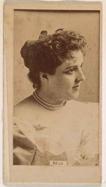 Curator: Let’s look at "Portrait of woman, from the Novelties series (N228, Type 1)," printed in 1889 by Kinney Bros. Tobacco Company. It's a small print, almost miniature-like. Editor: There's a strange innocence to it, yet something about that fixed smile feels incredibly staged. Is it just me? Curator: Consider the historical context. These “novelties” were designed as collectible inserts in tobacco products. The primary function was commercial; they were selling an image, and aspiration. The woman depicted wasn't necessarily a "real" person. She’s a type. Editor: Yes, the woman seems archetypal of that late Victorian "ideal"—perfectly groomed, radiating respectability. It strikes me as propaganda; a reinforcement of gender roles wrapped up in consumerism. These kinds of portraits in these years reflect societal control mechanisms. Curator: From a symbolic point of view, that is interesting because portraits themselves are signifiers of social identity, of power structures and this one also highlights beauty. But that's something we assign as a culture, so how is our reading impacted when a company commodifies the portrait? Does she stand for "ideal beauty", is she merely an archetype for the upper class, or a commodity that invites consumers to experience something akin to power and desire? Editor: That last option hits close to the mark, because these portraits circulated in society becoming conversation pieces that impacted gender relationships and set beauty expectations for young women, and of course there's race in the mix, that these portraits where almost exclusively from White subjects. The impact on collective perception is real. Curator: It’s remarkable how a seemingly innocuous little print can open up so many layers of social meaning. Editor: Precisely! And it compels me to reflect upon today's ubiquitous "image culture"—what kinds of ideals are being manufactured and distributed now, and to what end?