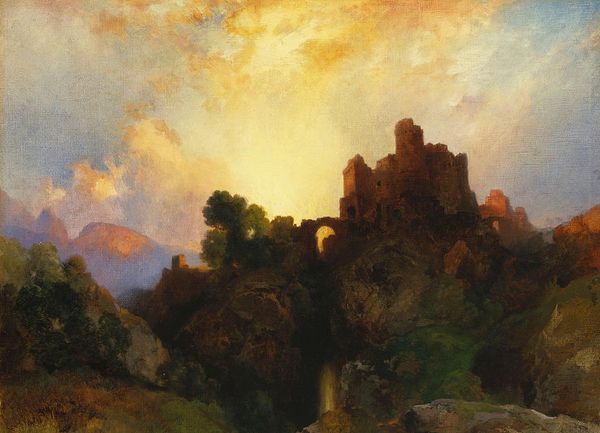 Curator: Here we have Carl Spitzweg's "Talschlucht mit Sennerin," dating back to 1875. He rendered this oil-on-canvas scene with meticulous detail. What's your immediate reaction? Editor: It strikes me as simultaneously grand and intimate. The towering mountains convey nature's power, yet the lone figure brings a quiet, human element. The scene feels charged with unspoken stories. Curator: Precisely. This embodies a romantic ideal: a dialogue between the individual and an often imposing natural world. What might that single figure signify to you? Editor: I see a shepherdess, traditionally a figure of both innocence and connection to the land. She reminds me of older pagan symbols in the way she carries a reverence for natural cycles, as she navigates her specific place in it. The steep valley seems to become a metaphor, perhaps, for life's journey. Curator: The valley path may indeed represent challenges, especially within the societal roles designated to women, whose bodies have long been symbolically linked to 'nature'. The Romantic era, while celebrating nature, also frequently romanticized specific, often constrained roles within it. Spitzweg captures that tension subtly. Editor: What resonates for me is how these motifs—the mountain, the valley, the shepherdess—become concentrated reservoirs of meaning, acquiring new relevance through time, and cultural change. They aren't simply representations, but encoded narratives. Curator: Exactly. Spitzweg uses accessible, realist painting techniques to subtly encode ideas about our place in nature, filtered through contemporary class and gender structures. This highlights the Romantic's tendency of framing identity through specific intersections with their natural world, revealing power dynamics both implicit and explicit in landscape. Editor: So, the image’s charm lies in how it triggers recognition. It sparks dialogue in our consciousness of historical narratives. It is how we reimagine those tropes today that breathes fresh air into the older symbol. Curator: Indeed. Spitzweg provides a tableau ripe for constant reinterpretation—offering viewers from diverse backgrounds access into a visually charged and ideologically rich landscape. Editor: A perfect starting point, then, for further reflection. Thank you.