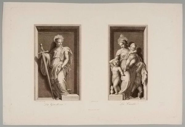 Curator: This print by Gaetano Bonatti at the Harvard Art Museums features three classical figures: Venus Pudica, Venus, and a faun playing a flute. Editor: The precision of the engraving makes these figures feel incredibly tactile, almost as if they're carved directly onto the page. Curator: Bonatti's print participates in a long history of reproducing classical sculpture, making these images available to a wider audience beyond those who could visit the original artworks. Editor: It's interesting to consider the labor involved in both the original sculptures and the printmaking process. The transfer of form from stone to paper requires a different kind of skill, but also conveys a sense of value. Curator: Absolutely, and the placement of these figures—the goddesses alongside the faun—speaks to shifting attitudes in the consumption and display of art. It normalizes classical ideals of beauty and pastoral leisure. Editor: I agree. The print serves as both documentation and active agent, shaping cultural ideals and influencing aesthetic appreciation. It really showcases the dynamic relationship between art and society.