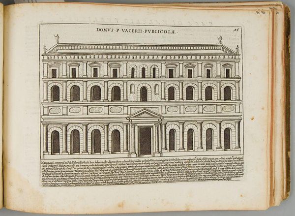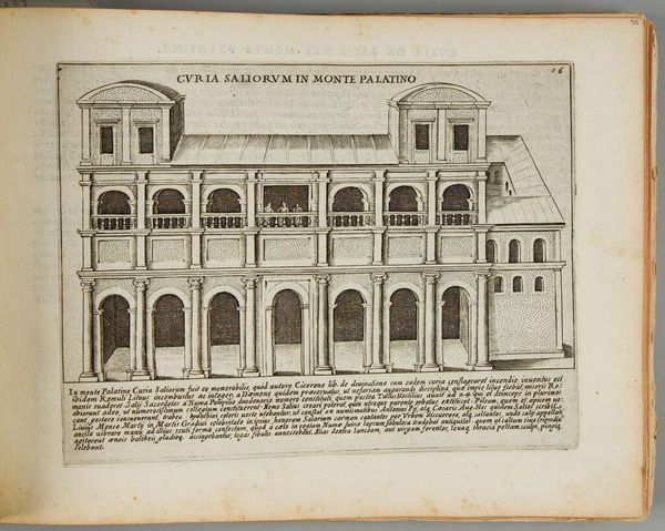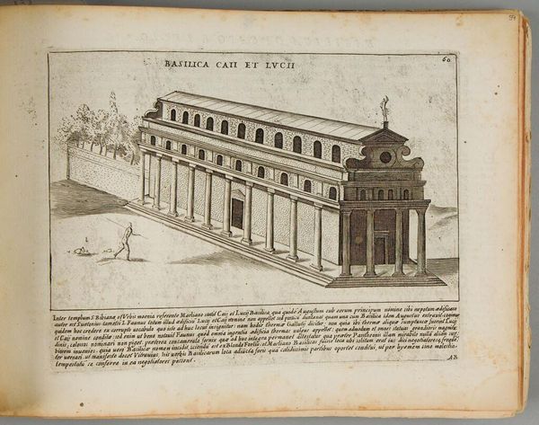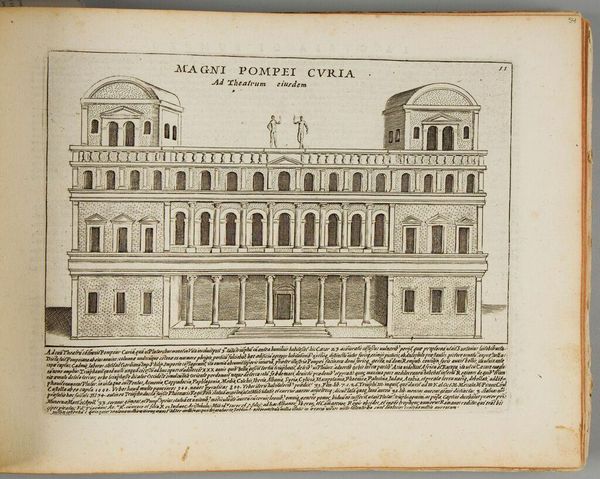 Editor: This is Giacomo Lauro's "The House of Publius Cornelius Scipio Africanus," held at the Harvard Art Museums. It's a fascinating print, with such meticulous detail. What strikes you most about its composition? Curator: The print emphasizes proportion and balance through its symmetrical design. Observe how Lauro uses the columns and arches to create a rhythmic pattern, drawing the eye upward to the central dome. Do you notice how line and form contribute to the overall sense of order? Editor: Yes, the geometric precision is definitely deliberate. The dome especially, how its curves contrast with the sharp angles of the rest of the structure. What does that signify to you? Curator: Precisely. The contrast introduces visual interest, a focal point that disrupts pure symmetry. This tension between the linear and the curvilinear is what gives the image its dynamism, despite the static subject matter. Editor: That’s a perspective I hadn’t considered. So, it’s the interplay of forms that makes it compelling, not just the historical subject? Curator: Indeed. It is the careful manipulation of visual elements that elevates this architectural depiction beyond mere representation. The work embodies a visual language that rewards detailed analysis.