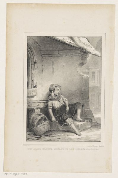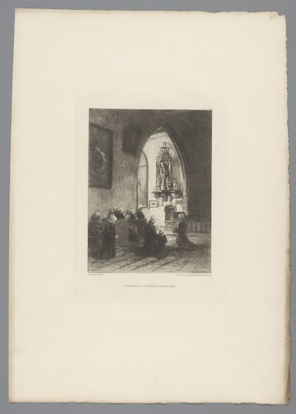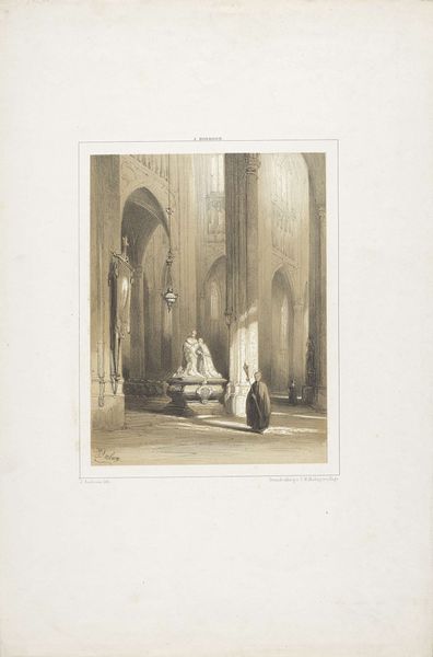 This drawing by Henri Brispot presents a church interior where a man is sitting asleep with his head resting on his hand. The man, possibly a church official given his attire, is rendered with a series of fine, controlled lines that define form and texture. Brispot's delicate use of line creates gradations in tone, particularly noticeable in the shadowed areas around the man and his ornate chair. The contrast between the dark foreground and the softer, lighter background emphasizes a visual and thematic dichotomy: presence and absence, wakefulness and sleep. The structure of the composition is significant; the sleeping man is positioned slightly off-center, drawing our eye to the composition's themes of human frailty, while a larger narrative about spirituality in an era defined by rationalism and skepticism is implied. Brispot employs a semiotic system where the church setting, the man’s slumber, and the abandoned holy water could be read as signs of spiritual lethargy or perhaps a commentary on faith.