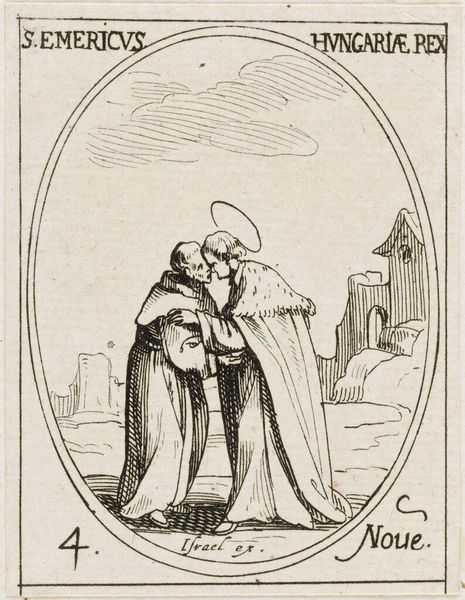 Editor: This is Jacques Callot's "Christ the Savior," an etching from around the early 17th century, located at the Harvard Art Museums. The figure of Christ feels very imposing and central, but the surrounding scenes are quite disturbing. How do you interpret this work? Curator: This image is potent in its simultaneous display of religious authority and the brutal realities of its historical context. Consider Callot’s era – rife with religious conflict and social upheaval. How does this image challenge or reinforce power dynamics? Editor: That's interesting. I hadn't considered the connection between religious art and social power structures. Curator: Exactly. By juxtaposing a dominant Christ with scenes of suffering, Callot invites us to question the role of faith in the face of human cruelty. Art becomes a powerful tool to reflect on societal injustices. Editor: Thanks, that provides a fresh perspective on the piece!