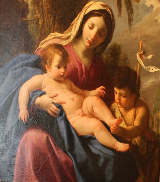 Editor: This is Ernest Hébert’s "Madonna with Christ Child and a Boy," painted in 1892. It's an oil painting, and the figures feel very tender. What strikes me, though, is how somber everyone looks despite the clear religious symbolism. What do you see in this piece? Curator: I see a painting deeply embedded in its historical moment, reflecting complex anxieties about faith and societal roles. While visually rooted in the Romantic style, Hébert is also grappling with a changing world. Note the almost staged presentation. Mary isn't just a mother, she’s also performing motherhood for the young John the Baptist. Does that performativity remind you of any modern societal expectations of women, or in terms of power? Editor: That’s interesting! It's like the painting isn't just devotional but also about the role of women as these figures of purity and motherhood, observed and almost judged. It isn’t as genuine as one would expect a painting of motherhood to be. Curator: Exactly. And it challenges the narrative we often see. Consider, too, the absence of Joseph. This image highlights a particularly female-centric power dynamic that subtly resists the patriarchal structure normally imposed. It's not overt, but Hébert places the feminine at the forefront, almost sidelining masculine authority within the scene. Editor: So it's almost a commentary on the established roles of women versus the reality? I never considered looking at a Madonna painting this way. Curator: Precisely. The painting is more than just religious iconography. It prompts us to think about how cultural ideals around gender and power are constructed and reinforced. It certainly brings fresh awareness to how such paintings can reinforce gender expectations!