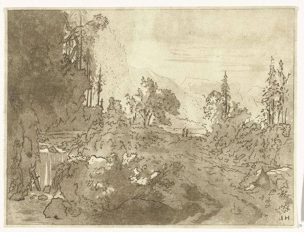 Curator: Before us is “Landscape with Two Mules before the Rocca Aquatico near Ancona,” an etching by Jan Both, created sometime between 1644 and 1652. It's a view, as the title suggests, of a location in Italy. Editor: It has an almost dreamlike quality, doesn't it? The delicate lines of the etching create this shimmering effect. There's a haziness, as though looking at a memory, and yet the forms are resolutely solid and defined. Curator: That tension between clarity and vagueness is key, I think. The muleteers, their donkeys, become almost allegorical figures within a classical landscape. Jan Both’s frequent use of this type of scene pulls on the tradition of the 'ideal' landscapes. It presents not so much an accurate record, as an emotive stage. Editor: The composition also plays a vital role. See how your eye is led first by the sharp detail of the mules in the foreground, then gently guided through the receding planes, the layering. And how much texture is made with so few precisely placed marks. The line work is simple but dense, with very delicate modeling techniques used throughout. Curator: Mules, as beasts of burden, are quite common, aren't they? The path they traverse symbolizes life’s journey, and these mules carry the weight of expectations, the collective toil of human endeavor, their plodding through history and experience. Consider, too, Ancona, its importance as a port...the coming and going, and exchange, both forced and willing. Editor: The trees, though, particularly the grand tree to the right, I'm drawn to how it seems to balance the weighty rockface across the path, how these strong vertical elements organize the space in the picture. The whole tonal structure relies on this. Curator: Ultimately, it evokes a deep connection to the land and highlights, for me at least, how landscape has become inseparable from cultural consciousness. It reminds us, perhaps, of the journey ahead. Editor: Yes, it does indeed, especially considering the weight of the historical and material forces at play. Thank you for bringing that to light.
