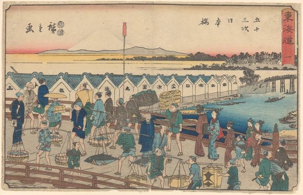 Editor: So, here we have Chōbunsai Eishi’s "Pleasure Boats on the Sumida River beneath Shin-Ōhashi Bridge," a woodblock print created sometime between 1782 and 1802. It depicts a bustling scene on the water. It strikes me as a snapshot of Edo period leisure, almost like a social register of its time. What do you make of it? Curator: It’s fascinating to consider this ukiyo-e print through the lens of social and gender politics. Note how the composition focuses on the lives and activities of courtesans and other women. It gives us insight into their roles and the limited freedoms within a rigid patriarchal society. These pleasure boats become sites of both confinement and display, no? Editor: That's a perspective I hadn't considered. They do seem on display. Could the artist be making a comment about their social positions? Curator: Perhaps. Ukiyo-e often portrayed the floating world—a space of transience and pleasure, yet simultaneously subject to social constraints. These prints were, in turn, consumed by a broad audience, including the merchant class, further complicating the relationship between art, commerce, and social hierarchy. How do you see this interplay in the visual elements? Editor: Now that you mention it, the bridge, normally a connector, almost seems to barricade the scene, further confining the figures to their watery stage. Curator: Exactly! By understanding ukiyo-e as a social and political document, we uncover its potential for agency and resistance, albeit subtle and coded. Editor: I see! Thinking about it that way gives so much more depth. Curator: And that's why it’s so important to connect art to social theory! It transforms the act of viewing. Editor: Thanks for this insightful perspective. I’ll definitely be researching Ukiyo-e more deeply now.