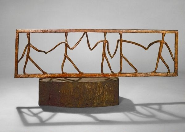 Curator: This is William Turnbull’s "Mobile Stabile," a bronze sculpture in the Tate collection. It's a fascinating piece. Editor: It’s striking—almost like an abstract landscape, but also strangely unsettling with those spiky forms. Curator: Turnbull, influenced by post-war anxieties, explored themes of alienation and the human condition through abstract forms. This piece embodies that tension. Editor: The linear structure and the contrast between the solid base and the delicate, almost skeletal, extensions above are really compelling. It feels like a study in balance. Curator: Absolutely. The choice of bronze lends it a weighty, almost primitive feel, contrasting with the implied movement of a mobile. Editor: Seeing it now, I wonder if Turnbull was commenting on the fragility and resilience of society post-war. It's an interesting contradiction. Curator: It’s certainly a work that invites multiple interpretations. Editor: Agreed. A powerful piece that encourages contemplation on form and meaning.