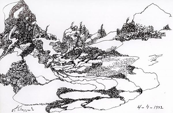 Martiros Sarian made this landscape, Lori, with pencil on paper, and you can really sense the hand in this work. It's like he's feeling out the shapes, letting the pencil lead him. The texture here isn't about the paper itself, but the built-up lines creating a surface. Look at the way he renders the foliage in the foreground – these tight, scribbled lines, almost vibrating. It's fascinating how the density of these marks defines the forms. It's not quite realism, but it conveys the essence of the landscape, as if he's channeling the spirit of this location, the place he is looking at. Sarian reminds me a bit of Cezanne, especially in how he breaks down the landscape into these geometric forms. Both artists are interested in structures, rather than just painting pretty pictures; they're both interested in a deeper kind of seeing.