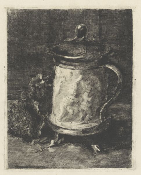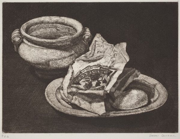 Editor: Here we have Pieter Claesz’s "Still Life with Goblet, Silver Tureen and Bread," from 1637. It’s a remarkably detailed oil painting, featuring, as the title suggests, a goblet, a shiny tureen on its side, and a piece of bread alongside some fruit and nuts. The objects are incredibly tactile. How would you interpret the meaning conveyed through these carefully chosen materials and objects? Curator: Considering Claesz was working during the Dutch Golden Age, a period of immense mercantile expansion, it’s difficult to ignore the blatant display of wealth. But I wouldn’t necessarily equate it with celebration. Notice the tipped tureen, the half-eaten bread, the scattered nuts – a sense of fleeting pleasure, almost a quiet admonishment against material indulgence. Think of it in relation to the labor involved. Someone had to craft that silver tureen, harvest the grain for the bread, sail the seas for those lemons. Are we meant to consider that labor when enjoying the *results* of that work? Editor: That's a very interesting point about labor. So you’re saying the painting prompts a dialogue about the human effort that underlies these opulent objects, maybe making us aware of inequalities inherent in wealth? Curator: Precisely! The material elements invite us to consider the economic structure that brought these goods together, and perhaps even our role as consumers in perpetuating that system. And ask yourself, who is being *denied* this sort of opulence so that the buyer of this painting can afford it? This wasn't just about the *acquisition* of material things, but about how this affected labour across society. Editor: I see now. It is a lot more complex than a mere pretty picture, and you really made me rethink the deeper issues it addresses. Curator: Absolutely! Art is about those dialogues across society, and the Dutch Golden Age makes them unavoidable when assessing paintings like this.