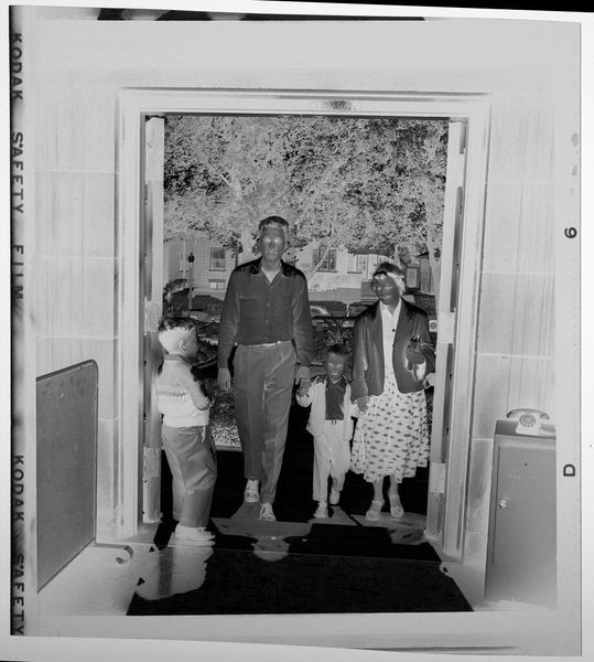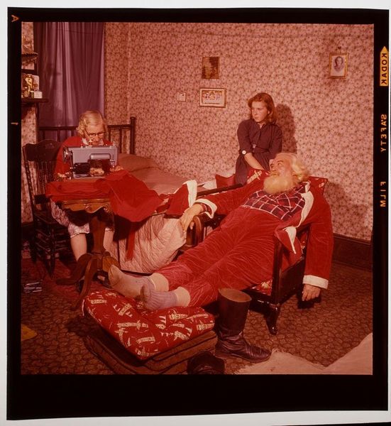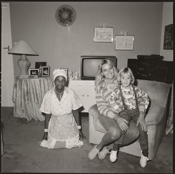 Curator: Rosalind Solomon's photograph, "Mother, Daughter, Maid (Johannesburg, South Africa)," captures three figures in what appears to be a domestic space. Editor: It's stark, the composition is really direct and uncomfortably intimate. The maid is kneeling in the foreground while the mother and daughter are seated behind her, creating a sense of imbalance and hierarchy. Curator: Solomon's work often explores complex social dynamics. Considering the context of apartheid-era South Africa, the image speaks volumes about power, race, and the deeply embedded class structure of the time. Editor: Absolutely. The maid's uniform, the positioning, it all underscores the material reality of labor and the stark disparities in lived experiences. Even the interior design feels loaded with meaning about class and taste. Curator: It's a powerful commentary, and one that forces us to confront uncomfortable truths about the social fabric of that era. Editor: It's a photo that stays with you, prompting a deeper consideration of the systems at play.