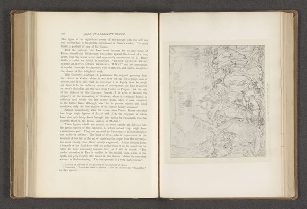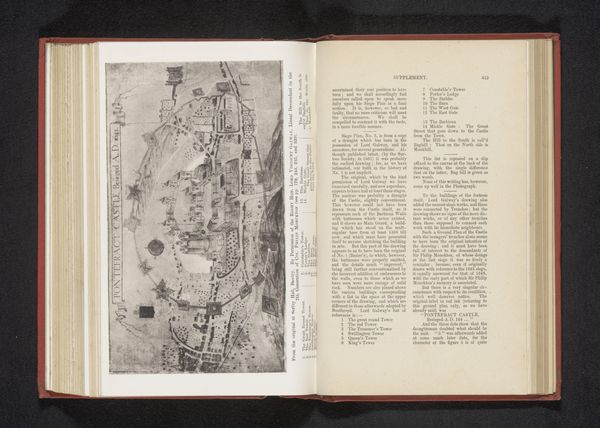 Editor: Here we have a reproduction of a map of Pontefract, created before 1887. It's an engraving, and it’s giving me this detached, almost bird's-eye perspective of the cityscape. What catches your eye in this piece? Curator: It is interesting how the lines define the space. The very architecture is evoked using very stark, thin lines. Note how the engraver uses varying line weights to articulate the differences in the landscape’s surfaces. Look closely; do you observe how textures are being created merely through varied line density? Editor: Yes, I see that. The density definitely creates the darker areas that suggest depth. How does this conscious construction through line contribute to the artwork? Curator: It foregrounds the idea that a city, like any representational form in art, is carefully planned and executed, a network of interlocking components represented here through the formal properties of line and space. The print uses the basic elements of art, such as line and value, to produce a stark image whose formal austerity belies the complexities it signifies. Is it representational of a moment or of a duration? Editor: It makes me think about how maps are both practical tools and artistic renderings, where form follows function but also expresses a specific worldview. Thanks, this close-reading approach is something I'll keep in mind. Curator: It’s a valuable reminder that a critical vocabulary is not necessarily determined by historical data, so it may be employed as the tools with which to better understand all artwork.