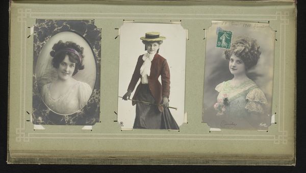 Curator: Here we have "Drie portretten van actrices, onder wie Marcelle Lender" created sometime between 1900 and 1930 by Ch. Reutlinger. It's a photographic piece. What's your immediate impression? Editor: There's an undeniable air of staged theatricality about it, wouldn't you say? And something about the slightly muted colours evokes both luxury and artifice. It makes me consider performance and presentation. Curator: I see it similarly. Reutlinger captures three staged images within one frame. Note how the artist frames them separately, accentuating different facets of early 20th-century celebrity and beauty ideals. It really strikes me as intentional that the figure in the central portrait holds a mirror to her own face, drawing attention to performativity itself. Editor: Absolutely. Each portrait presents a carefully constructed persona. Considering the historical context, one might consider how such images shaped public perception of actresses like Lender, particularly regarding their role in broader social dialogues on femininity and power. These images circulated widely, influencing fashion, expectations of women, and much more. Curator: And how potent those images become when considered in multiples! Grouped together, the portraits present a symbolic tableau—the performer demurely turned away from our gaze in one panel; boldly front-facing in the next with her own mirror, actively observing herself, her presentation; and another in yet another entirely distinct character. A complete, or perhaps incomplete, series of public poses for consumption. Editor: The poses become somewhat subversive, I believe. Reutlinger perhaps is offering multiple representations, yet the control and the access to Lender’s narrative still lie with Reutlinger, potentially perpetuating the objectification of female performers rather than empowering them. These women could be reduced to commodities despite the appearance of artistic reverence. It's worth delving into these layers. Curator: You're right. Those complex layers—the play of looking, performing, and being seen—give these portraits a lasting resonance. They encourage a close look at not only the image but the ways in which art both reflects and constructs the ideas it means to express. Editor: Indeed, analyzing who holds the gaze and for what purpose is central here. Thank you for shedding further light on this.