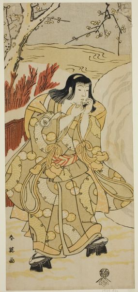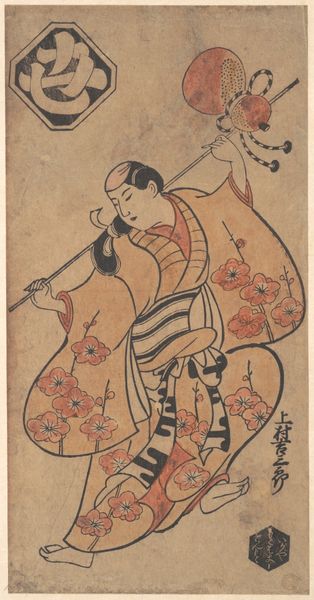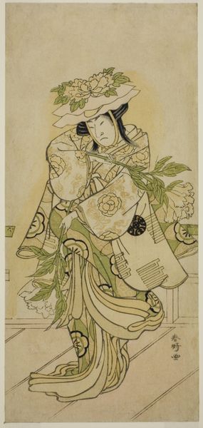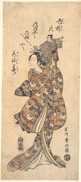 Curator: Oh, she's lovely. Melancholy, even. Editor: And radiant, simultaneously. We’re looking at "The Actor Hanaoka Miyako," a woodblock print made around 1700 by Torii Kiyonobu I, a master of the ukiyo-e style now at the Art Institute of Chicago. What strikes me is her stillness—almost like a carefully posed photograph. Curator: Precisely! Her expression is downcast, as if burdened by a hidden sorrow, yet surrounded by such beautiful ornamentation: flowers, a perfectly placed emblem overhead, intricate clothing with symbolic patterns on the outside and what appears to be clouds printed inside the kimono. A contradiction. Editor: This was the world of the kabuki theater. Hanaoka Miyako was not only a well-known performer but a pop icon of her day. Kiyonobu and others captured these performers offstage and through prints democratized access to celebrities. We're essentially seeing an early form of celebrity marketing. Curator: Well, marketing aside, there is something wonderfully vulnerable about her. The fact that she's not on stage allows us to look behind the performance of a "perfect woman." Do you see it, too? This almost palpable weight in her stance. Editor: I am sure the labor laws for actors were horrendous back then, and I can imagine this sadness comes from the strain of popularity at a young age. It’s interesting how this piece speaks volumes, not only about the individual but the complex relationship between performance, persona, and public consumption. The ukiyo-e prints are far more interesting to me when you recognize them as cultural documentation. Curator: Ah, so you read societal strain in her downcast expression. Fascinating. To me, this also says so much about our relationship to vulnerability as an essential, yet undervalued aspect of strength and personhood. The print becomes a silent ode to owning every layer of experience, both seen and unseen. Editor: On that somber yet poignant note, I believe we should let our listeners now absorb those thoughts. Curator: Yes. Go in peace.