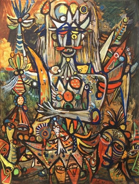 Wifredo Lam made this painting, "Mofumbe", using oil on canvas, and it is HUGE. I love how the colors here are both vibrant and muted at the same time, creating this kind of dreamlike space that makes it really unclear what's up and what's down. When I look at this painting, I feel like I can almost taste the paint. Lam’s brushstrokes aren't trying to hide anything. You can see how he built up the layers, like in the top left corner, where the brushstrokes move in all different directions. It's a reminder that painting is really about the process, the back and forth, the push and pull. Lam reminds me a little of Picasso, whom he knew. Like Picasso, Lam was always trying to find new ways to represent the world, but Lam brought a completely unique sensibility to the project. So much of art is just this ongoing conversation across time, each artist building on what came before, but always with their own voice.