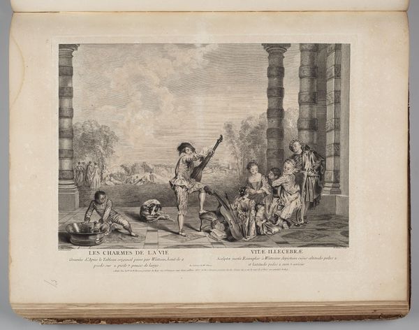 Curator: This is "Passing Time" by Benoît Audran the Younger, housed here at the Harvard Art Museums. Looking at it, I feel a sense of wistful leisure, don't you think? Editor: Absolutely. The printmaking process itself, though indirect, adds to that feeling; the etching implying a slower, more deliberate act of creation. Curator: Yes, the detailed etching really does capture the ephemeral nature of leisure, the fleeting moments of music and conversation in a pastoral setting. Editor: And the material reality of that leisure too—the clothing, the instruments, all point to a certain class and its access to particular forms of recreation. Curator: I see it as a reminder that even in moments of relaxation, time continues to slip through our fingers, doesn't it? Editor: A poignant reflection, and it makes me think about the labor that wasn't pictured. The underclass that necessarily provides for leisure. Curator: A sobering point, but perhaps the artwork allows us to find joy and sorrow can co-exist so intimately. Editor: Precisely, and by understanding that, maybe we can begin to reconcile some of those imbalances.