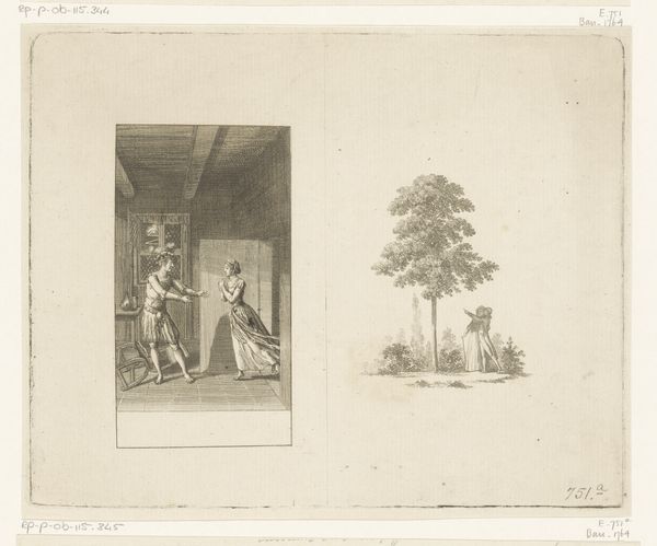 Editor: So, this is Daniel Nikolaus Chodowiecki’s "Dame als bruid en moeder," created in 1799. It’s an etching, currently held at the Rijksmuseum. What strikes me is the contrast between the idyllic outdoor scene on the left and the more contained, domestic scene on the right. What do you make of this pairing? Curator: The juxtaposition is key, isn't it? We have to consider this piece within the late 18th-century context, where Enlightenment ideals were clashing with deeply entrenched societal expectations for women. Think of it as a visual commentary on the limited roles available. Do you see how the 'bride' exists in a carefully constructed natural setting, almost like a stage? Editor: I do, yes, almost theatrical. Curator: Exactly. And then we’re thrust into the reality of motherhood, indoors, surrounded by children. The transition is stark, almost a loss of freedom. It highlights the expectations placed on women to move from the romantic ideal to the domestic sphere, often losing individual identity in the process. Where do you think we locate any sense of female agency here? Editor: That’s tough. I guess… in the domestic scene, there’s a sense of activity, of the mother being central. Maybe that’s where the power lies? But also trapped? Curator: Precisely. This tension is something Chodowiecki seems keen for us to see. Remember, artistic portrayals reflect and shape the lived realities and socio-cultural conditions of the time, defining and challenging accepted models of behaviour. Editor: It's fascinating to consider the print this way, placing it within these conversations about gender and societal expectations. Curator: Indeed. Seeing art as a reflection of its social moment expands its meaning and makes the experience relevant.