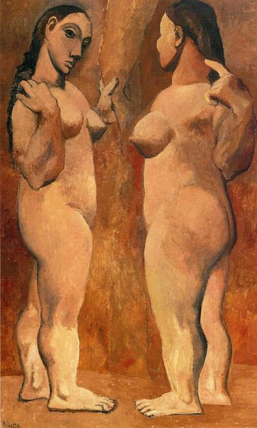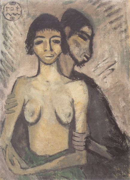 Editor: Right, let's talk about "Two Bathers," painted by Picasso in 1920. It's an oil painting featuring two figures, seemingly caught between classical and cubist forms. There's a rawness here, almost confrontational, in their gaze and the starkness of the rendering. What springs to mind for you when you look at it? Curator: What springs to mind? Hmmm... I think of wrestling with angels, you know? Picasso is always battling *something*. Here, it's the ghost of classicism versus the raw, disruptive power of modernism. Look at how he twists and stretches those forms, pushing them almost to the breaking point. It’s not pretty, it's powerful. Are they idealized nudes, or something more... visceral? More *real*, perhaps? Editor: I see what you mean about the 'battle'. The colors feel deliberately muted too, adding to the intensity rather than softening it. The woman standing, seems to look toward to us, almost like challenging us, what do you make of her stance? Curator: Precisely! That confrontational gaze. And her posture… so grounded, so defiant. Picasso isn't just painting bodies, he's painting attitude. The limited colour palette reminds me of faded frescoes, hinting at ancient grandeur, but there's a definite subversion. He’s twisting beauty to convey strength. You could say, what are the women looking at, are they figures from Greek mythology, perhaps the Fates? Are they here to look down on humankind and see if they deserve mercy. The artist forces us to wrestle with how the artist challenges these classical themes by using cubist features to distort the physical reality, so that the viewer may examine their concept of 'perfection', that which has been bestowed on humankind. Editor: It's fascinating to consider those tensions and defiance within one canvas. Thank you! Curator: My pleasure! A provocative piece and an ever challenging reflection.
