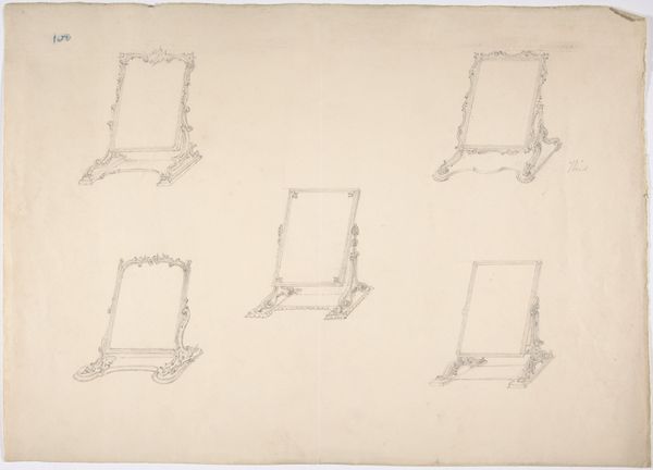 This design for two tabletop mirrors was rendered anonymously, likely as a preparatory study. It's made on paper with pen and watercolor. The drawing showcases the material qualities of wood, likely meant to be mahogany or a similar fine wood. The artist renders the weight and form through delicate pen lines and washes of color. You can see the process of woodworking implied here, the shaping of the legs, the joining of the frame, and the subtle carving of decorative elements. Consider the social context: mirrors like these were luxury objects, emblems of status in a world increasingly focused on personal appearance and presentation. The level of skilled work involved in their production speaks to the division of labor, and the economies that supported both the craftsman and the consumer. Looking closely at this design, we realize that even a simple object embodies complex relationships between materials, making, and social life.