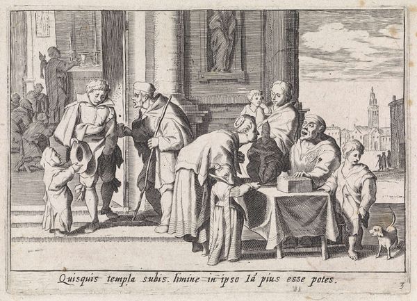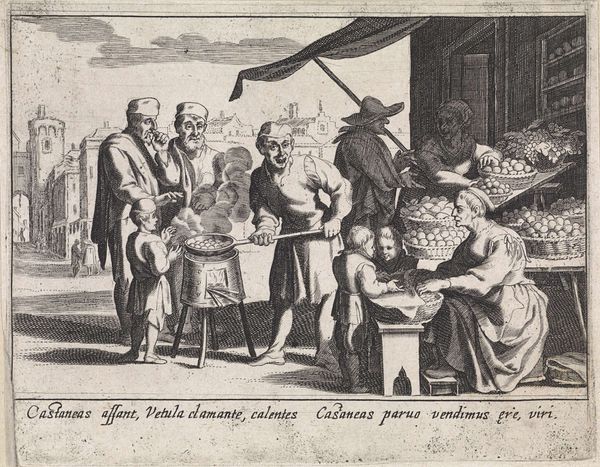 Curator: I find myself drawn to the sheer immediacy of this print. A fleeting moment captured, etched for eternity—well, nearly. Editor: Immediately I sense a certain chaos. The overlapping figures, the slightly frenetic lines... it feels less like a posed portrait and more like eavesdropping on a busy street corner. Curator: Indeed. This engraving, "Drankverkopers"—literally, Drink Sellers—likely made sometime between 1613 and 1667, gives us a slice of life from the Dutch Golden Age. Look how skillfully the artist has used etching to create depth and texture. Editor: The distribution of light and dark is fascinating. Notice how the artist directs the eye by making certain jugs luminous and leaving other parts almost in shadow. Almost as if the consumption, itself, is a central compositional device. Semiotic importance is difficult to miss! Curator: Absolutely! It reminds us of the fleeting pleasure, that communal experience—shared amongst these…working-class people, or city-dwellers? Notice the architecture as it rises up in the background. Editor: Speaking of semiotics, one can even interpret the empty jugs along the tables and streetside as visual signifiers for emptiness of a hangover; almost acting as a symbol of time wasted and the effects of such an environment on children that accompany these adults. Fascinating the number of narrative implications are here within the artist’s decisions to draw these items this way. Curator: I am captured with the expression on the face of the drink-seller at left; hunched forward with so much yearning…or demand. What might his story be? One is so left to wonder: the picture seems almost alive with untold tales. It beckons me to step into its past. Editor: And that, perhaps, is where its true genius lies, this glimpse, like holding a single note of some much larger symphony, inviting us into worlds both distant and perhaps deeply familiar. Curator: A perfect moment; capturing just one’s everyday, while still remaining universal for everyone to share for centuries later.