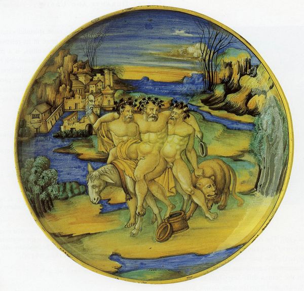 Editor: This plate, titled "Plate with Hercules and Lichas and arms of the Pucci family," dates back to 1532. It's a ceramic piece by Fra Xanto Avelli da Rovigo. It is striking to me how sculptural it seems to be; despite being a plate, there’s a real sense of depth and dynamism. What’s your take on it? Curator: Formally, the artist presents a fascinating tension between flatness and depth. Notice how the circular shape dictates the composition, forcing figures to its edge. But the landscape recedes using atmospheric perspective – the blue fading into the distance. It sets up a tension. Do you see it? Editor: Yes, it’s almost like they're playing with two different pictorial strategies at once. The foreground is so busy, with these robust figures in violent action and then that little lamb calmly to the right of them, versus that hazy blue vista behind, creates a sense of the scene overflowing the circular border. How else might form be communicating meaning here? Curator: Observe how the artist employed color. Predominantly blues and earth tones. What's the chromatic effect? The figures appear as though sculpted and illuminated from a dramatic and theatrical light source. It accentuates the Herculean form. The use of that gold trim around the plate brings closure but highlights it as artifice. What overall effect do you see in all of these choices? Editor: The dynamism definitely creates a captivating focal point and adds depth to the scene's inherent drama. That is great, it makes me see the plate with a fresh set of eyes! Curator: Indeed. Now we can look beyond just surface decoration. Thinking through structure clarifies purpose, providing visual proof of an aesthetic ideology.