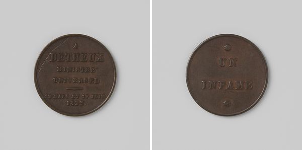 Curator: Here we have a print dating back to 1840, "Inhuldiging van Willem II, Koning der Nederlanden te Amsterdam," created by an anonymous artist, currently residing at the Rijksmuseum. The medium used appears to be an engraving. What are your first thoughts? Editor: It's rather austere, isn't it? Stark even. I get a real sense of... well, something very official and somber. Curator: That aligns, I think, given its theme. History paintings in print, especially engravings like this, served as reproducible records but were also carefully manufactured objects made using specialized technical skills for mass distribution. Notice how the precision of the engraved lines emphasizes the gravity and formality of the event it represents. The very act of replicating such an image reinforced the power of the monarchy and its accessibility across Dutch society. Editor: Yes, there is that. Thinking of symbols and what resonates, the crown obviously catches the eye immediately, resting above the crossed scepters. One automatically associates a king to royalty and nobility. Then, adding scepters further bolsters this sense of power. The overall mood evoked reminds me of classical Greek and Roman depictions of emperors. Curator: And perhaps it's worth noting the absence of explicit human presence? We're presented with signifiers, emblems representing power rather than the pageantry of the coronation. This restraint feels very deliberate in its construction. Editor: Exactly. It’s about the lasting idea of monarchy, the eternal symbols transcending fleeting individuals. Curator: Absolutely. As an engraving, consider the social implications here: who was this image marketed to? Engravings democratized image ownership but also acted as subtle state propaganda. What message was being delivered through its lines and the act of circulation? It serves to remind people what he ruled and represented. Editor: Indeed, it’s a fascinating distillation of power through enduring symbols. We get a layered sense of meaning. The historical event then morphs into iconic status through controlled symbolic messaging, wouldn't you agree? Curator: Precisely, and its reproducibility through the engraving process solidifies this status. Editor: This little coin carries so much weight and now it just begs further study. Curator: A lasting image, truly thought-provoking from its construction and implications.
