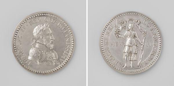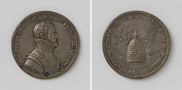 Curator: This exquisite metal relief is a portrait miniature of Antoine Perrenot, Cardinal Granvelle, made in 1561 when he was appointed Archbishop of Mechelen, crafted by Jacques Jonghelinck. Editor: My first impression is a striking duality: one side severe and ordered, the other chaotic, like two sides of a coin revealing conflicting realities. Curator: Precisely. On the obverse, we see a meticulous profile of Granvelle, rendered with crisp lines and an emphasis on the textural detail of his beard and clerical garments. It projects authority, contained within the circular boundary of the medal. Editor: While the reverse plunges us into a tumultuous seascape, with figures flailing amidst a shipwreck, Neptune rises from the waves. It’s rich with allegorical possibilities; is it meant to symbolize Granvelle’s ability to weather any storm? Curator: The dynamism and dramatic density of figures create visual tension against the portrait’s static composure. The waves, the collapsing ship—each element is rendered with energetic detail. Semiotically, the two sides create a visual paradox of control versus chaos. Editor: The figure of Neptune especially, wielding his trident—that image has persisted for millennia across cultures. It invokes power, mastery over the sea...but also the sea’s unpredictable, destructive nature. Did Jonghelinck mean to imbue Granvelle with those conflicting aspects of the sea god? Curator: Possibly. This medal, typical of Renaissance portraiture, transcends mere likeness. The strategic contrast—between controlled portraiture and unrestrained narrative, highlights a tension between individual identity and the forces shaping historical events. Editor: So, what does endure isn’t just Granvelle’s features, but also a powerful condensation of anxieties of his time. We recognize the archetypes, these elemental struggles, and that speaks across centuries. Curator: A sophisticated articulation of power dynamics within the visual vocabulary available to Jonghelinck. Through an informed composition, this piece reveals not just a man, but the period itself. Editor: Yes, reflecting how even miniature forms like this can echo with historical memory and invite interpretation. Curator: I agree. This portrait embodies a potent duality – simultaneously capturing personal and socio-political contexts, leaving a lasting artistic record.