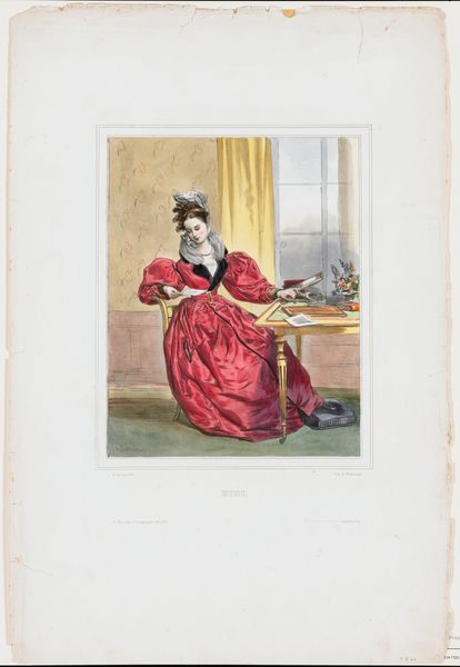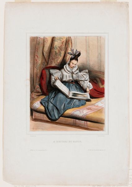 Editor: This is Achille Devéria's "Heures Du Soir. Mlle. Laure Deveria," a lithograph print from around 1830. The delicate lines and use of color create an intimate and somewhat melancholy mood, don't you think? What do you see in how the artist utilized the print medium for this genre scene? Curator: I see the lithograph as crucial to understanding the social reach of this image. This wasn’t a unique artwork for an elite collector. It was made to be reproduced and distributed widely. The materials -- the paper, the ink, the printing stone itself -- and the labor involved in their manipulation made the image accessible to a broader audience and arguably helped disseminate ideas about beauty and leisure at the time. Think about how this image might have influenced notions of femininity and domesticity in a burgeoning consumer culture. Editor: So, you're saying the *reproducibility* of the lithograph is key to its meaning? I hadn’t considered how that accessibility plays into the art itself. Curator: Precisely. The image depicts a woman of leisure engaged in artistic pursuits, and the *lithograph* itself enables the circulation of such ideals. Do you think it accidentally replicates the same leisure it depicts? Editor: Wow, that's fascinating. It almost feels like it’s trying to democratize art through its production and consumption, while simultaneously depicting the privileged few. I didn’t realize a seemingly simple print could be so layered. Curator: Indeed. The materials, production methods, and distribution networks are just as meaningful as the subject portrayed. Analyzing them can offer fascinating insights into the culture that produced it. I appreciate your initial observations about the mood, though! It's through observations of feeling AND making that meaning arises. Editor: I agree. Thanks, I definitely have a different appreciation for this piece now!
