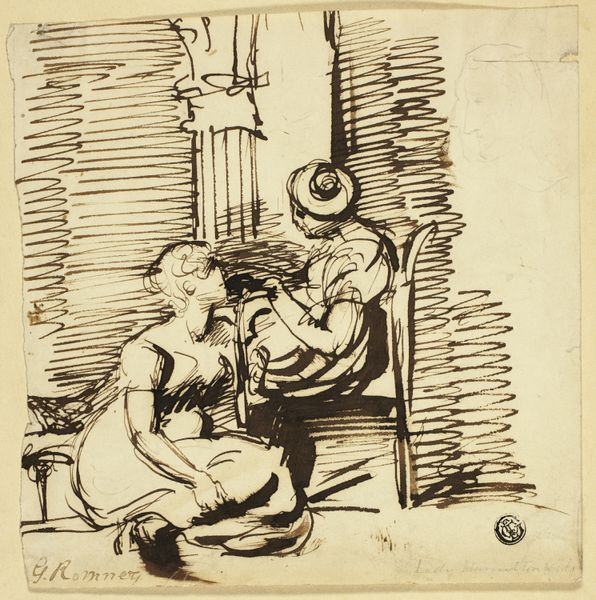 Curator: This ink drawing by Constantin Guys, titled "After the Ballet," captures a fleeting moment backstage. It's currently part of the Art Institute of Chicago's collection. What strikes you about it? Editor: The immediate sense is of frantic energy and transience. The rapid strokes, the somewhat smudged ink – it conveys a feeling of backstage bustle rather well. There’s something almost Degas-like, but more raw. Curator: Absolutely. Consider Guys' technique – the swift pen strokes and graphite underdrawing. It’s very much about capturing a sense of immediacy, documenting modern life as he saw it. The use of layered ink washes also indicates experimentation. It challenges established art boundaries by showcasing an informal scene. Editor: And that informality feels deliberate, doesn't it? He’s showing us not just the dancers, but the support structure around them. Look at the woman on the floor, perhaps mending a costume – it reminds us of the labor behind the spectacle, and how the stage glamor relies on that type of activity. The class system and support surrounding performance are really what makes an audience react as a singular whole, as well as to perceive ballet a certain way. Curator: Precisely. Guys was, after all, a keen observer of social dynamics. The ballet in his time represented more than mere entertainment; it was entwined with the spectacle of wealth, class, and cultural expectation. His role as an illustrator played a crucial role here. The accessibility of this work to a broader audience, thanks to print culture, reveals a certain democratizing impulse behind image consumption. Editor: I find it interesting how the work skirts sentimentality. The composition, the rough strokes, almost resists romanticizing ballet or its performers. Instead, it captures a specific social moment—the transient reality of the performers as they navigate these institutions of high culture. There is even a sort of caricature present here of an elegant older male character standing on the left. Curator: And note how that sense of captured social energy speaks to its endurance in the collection. Its material qualities, too—the humble pen, ink, and paper—belie the profound social narratives that such scenes convey. The act of making in itself then is both simple and profound, as social illustration of all kinds often has the effect of commenting on complex socio-economic themes. Editor: It does leave one contemplating the unseen work—the physicality and support that contribute to those brief moments of theatrical display that elite art goers are exposed to—often fleeting in their beauty. Thanks to this depiction and distribution through drawings in a relatively reproducible material format, the labor around these productions can also be briefly enjoyed and understood. Curator: A really wonderful point. Thank you for your insights!