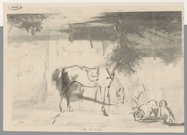 Editor: This is "En kostald i en bondegård," or "A Cowshed in a Farm," a watercolor drawing by Johan Thomas Lundbye, created in 1844. It gives off this immediate impression of simple, rural life. What grabs my attention is how casually he depicts the cows in their daily environment. How do you interpret this glimpse into 19th-century farm life? Curator: Lundbye presents us with more than just a genre scene. The painting's realism, a burgeoning artistic movement, signals a societal shift towards valuing depictions of everyday life and ordinary people. The seemingly casual arrangement of the cows and the rough hewn structure of the barn reflects a growing national romanticism and an increasing pride in Danish rural heritage. Editor: That’s interesting, this idea of elevating rural life… so the artwork plays a role in that? Curator: Absolutely. How do you think depicting cows within the context of a Danish farm, for instance, would impact its audience at that time, given the historical circumstances? Lundbye romanticizes the idyllic image of rural Denmark at a time of burgeoning nationalism and political changes, emphasizing the value and contribution of country people. It also reflects the political climate of Denmark in the mid-19th century. What stories do you think the drawing aims to tell? Editor: Well, looking at the drawing this way definitely changes my perspective. At first, it felt like a basic image, but now I see its socio-political depth and meaning in representing the cultural and national identities of 19th-century Denmark. Thank you. Curator: And I see your quick understanding, especially noting the connection between landscape and nationhood, has given me a fresh perspective on Lundbye's strategic approach.