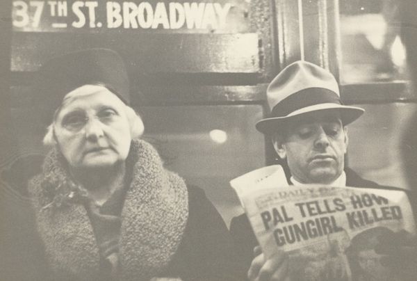 Editor: Today we're looking at Robert Frank's "Street Scene - Chicago," a gelatin silver print from 1956. I'm struck by how…unromantic it feels. Street photography often tries to capture candid moments of joy or quirky beauty, but this is different. It seems to suggest urban alienation and disconnection. What do you think? Curator: It’s a masterful observation. The beauty, if you can call it that, is in its brutal honesty, its refusal to prettify the modern experience. Think of it less as a "street scene" and more as a fleeting observation from a car window, a moment of "snapshot poetics," to borrow a phrase from the time. Frank wasn’t looking to capture "the decisive moment," in Cartier-Bresson’s words. He wanted to disrupt it, to capture its underbelly. Look at how the man in the foreground almost blends with the advertisement behind him, trapped. Doesn’t it suggest the subtle unease of consumer culture? Editor: Absolutely. The man looks like he’s being advertised himself, completely absorbed into that context. It reminds me of Pop Art! Curator: In a way, yes. While Frank's work pre-dates the full flowering of Pop, it shares its interest in the iconography of everyday life. The poster, the generic man – all these elements critique a postwar America obsessed with media and conformity. Editor: I get the sense that he captures an emotion more than documenting a specific location or a situation. What could he mean by doing that? Curator: Yes. Perhaps to showcase his emotional response more than simply depicting the time and location. By making his reaction part of the piece, Frank invites us to question our role and position ourselves relative to the cultural moment and imagery of the day. In which lies the real truth? That’s the beautiful and elusive intention behind the scene, if you like. Editor: That gives me a whole new perspective to appreciate Frank’s intention behind the camera lens! Curator: And that's the marvelous mystery behind every art piece, isn't it?