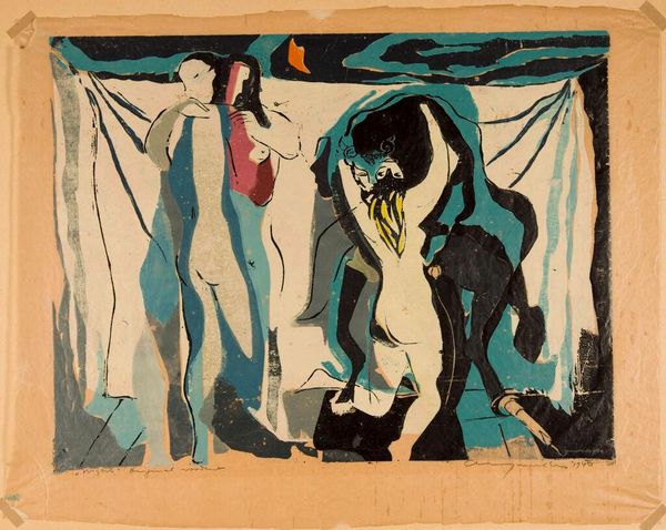 Curator: Here we have Ernst Ludwig Kirchner's "Küche im Frühling," or "Kitchen in Spring," a woodcut from 1933. It presents a scene of figures amidst grazing livestock in a field. What are your first thoughts? Editor: It's quite striking. The animals feel both animated and flattened, as though bursting with life but also trapped within the picture plane. The colors feel deliberately disharmonious—what's with those lavender udders? There's something uneasy about the whole scene despite its seemingly pastoral subject. Curator: It is worth noting that Kirchner was associated with the German Expressionist movement, known for its bold colors, distorted forms, and often, an underlying sense of anxiety. In 1933, the Nazi Party came to power in Germany, declaring his work degenerate, which caused him to flee. So the anxiety may stem from this turmoil, both in Kirchner’s personal life and the socio-political climate. How might we interpret the imagery through that lens? Editor: Well, fields and farm life in general often signal continuity and stability, the cycle of nature undisturbed, particularly in the visual traditions of Europe. But this idyllic image feels subtly destabilized. Notice how he contrasts the bulky farm animals to the wiry humans behind them. They look like they are more overwhelmed and alienated than anything. Is this a metaphor for a people uprooted, disoriented in their own landscape? Curator: That's a perceptive reading. Woodcut, as a medium, has a history of being a tool of the popular press, so Kirchner may have turned to it intentionally here. Looking closely, one could speculate whether Kirchner uses simplified animal and human forms to highlight our shared animal nature and what connects us, and how the loss of familiar connections breeds uncertainty and anguish. Editor: Yes, those thick, coarse lines really hammer home that connection. The reduction of forms certainly contributes to the piece’s emotional impact. And, strangely enough, for such an abstracted composition, there's real cultural resonance here. When I see this I can see the shadows of folk myths and agrarian rituals around seasonal cycles. The animals feel less like actual cows, more like the living embodiment of a vital energy in crisis. Curator: Indeed, perhaps “Küche im Frühling” holds within it a potent allegory of a world teetering on the edge of unprecedented change, capturing the inherent disruption beneath the façade of normalcy. Editor: A beautiful observation; thanks for opening my eyes to these additional layers.