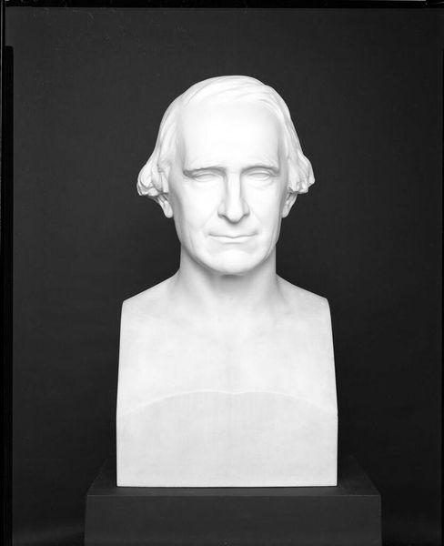 Editor: Here we have Daniel Chester French’s bust of Ralph Waldo Emerson. The marble's surface is so smooth, it almost glows! What strikes you first about its composition? Curator: The planes of the face, the geometric structure beneath the skin – these elements are rendered with exacting precision. The lack of surface ornamentation encourages a focus on the sculptural form itself. Editor: Do you think the simplified planes detract from its realism? Curator: Not at all. The simplification elevates it beyond mere portraiture, towards an idealized representation of intellect. The way light plays across the forehead and cheekbones creates a powerful sense of depth. Editor: I see. I hadn’t thought about it in terms of idealization before. Curator: Consider how the artist uses line and form to communicate not just likeness, but also character. It’s a fascinating exercise in pure form. Editor: Thanks. It's made me rethink my understanding of portraiture.