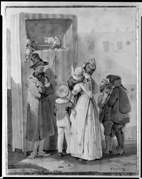 Curator: The title translates to "An Old Beggar at the Door Receives Alms from the Children of the House", created by August Krafft sometime between 1813 and 1829. What strikes you first about this work? Editor: It has a stark, almost unsettling contrast between the warmth of domesticity and the visible desperation of the beggar. The children appear like angels of mercy, juxtaposed against the stark reality of poverty at the doorway. Curator: Absolutely, it encapsulates Romanticism's interest in contrasting ideals. Beggars were potent symbols—vulnerability, social inequality, perhaps even spiritual testing. Note how Krafft frames the beggar in shadow, but he's placed centrally, interacting directly with the children. It disrupts any simplistic reading of charity as solely virtuous. Editor: Yes, and that disruption feels intentional. Look at the children's faces—a mix of compassion and curiosity, maybe even fear? It seems Krafft uses them to mediate between the stark realities of the outside world and the sheltered existence within. The woman holding the baby almost looks away, not fully engaging. This composition makes you consider the varying responses to poverty within a single household, reflective of the society at large. How was it exhibited? Who was the target audience? Was it designed to evoke empathy, or simply reinforce social hierarchy through benevolence? Curator: Good point. In genre painting like this, symbolism served specific audiences. During the Romantic era, representations of the poor often carried coded political messages—especially regarding the perceived failures of industrialization. Krafft may be drawing on religious iconography of giving as well. Editor: And does the inclusion of a window at the left signify an opening or connection to the wider world, literally? Is it supposed to give the painting another dimension and deeper context, in a broader symbolic representation of the connection between inside and outside worlds, so to speak. Curator: That window might represent just that - literally opening up the scene from inside to outside world! Also notice that the landscape shows the sky and some buildings - what can that potentially convey to its viewers. Editor: I believe with Krafft's work, we have just barely scraped at the surface with our assumptions of its intent, in this thought provoking art. Curator: It just reveals the power of art. Each observation deepens appreciation.