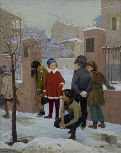 Curator: Ah, yes, Erik Henningsen’s “Evicted Tenants,” painted in 1892. It's currently held here at the SMK, the National Gallery of Denmark. Quite a scene, isn’t it? Editor: Utterly bleak. Visually, it feels like the snow is burying the figures, just like the crushing weight of poverty. So, let's talk about the literal stuff here: notice the assortment of household objects cast out on the snow: bedding, chairs, buckets…it screams material hardship. Curator: Henningsen captures the stark reality of urban poverty with such poignant detail, wouldn’t you agree? Each face seems etched with worry, resignation, and exhaustion... You almost feel like the scene whispers directly to your heart. Editor: True. And those material possessions… those are all objects intimately connected with daily survival. Their placement in the snow implies their devaluation, and more tragically the dispossession of these human subjects. Where were these goods made, who purchased them, how many hours did these individuals labor? Curator: A grim winter tableau indeed, but it's more than mere sentimental genre painting, it makes a clear and stark comment about injustice, wouldn't you say? Look how the figures are arranged; a huddled mass, contrasting with the police officer and another figure near the door; symbols of authority. The painting becomes an echo of real life at that time. Editor: Indeed. What tools did Henningsen use? I want to know about his choice of oil paints; a medium strongly tied to elite portraiture in Denmark in the late 1800s! In the late 1800s, Oil paint was considered a valuable material: Who had access, who provided the pigments, how was it received? Curator: It's interesting how he takes something considered ‘elite’ like oil paints, and uses it to amplify the plight of these working-class people, but for me, there's a human truth that transcends materials. It gets at the heart of human dignity. How could they reclaim it at this moment of utmost disgrace, do you think? Editor: I see the artist weaponizing traditional techniques in order to question power dynamics. Where was Henningsen buying those brushes? From what industrial sources did his colors come? And whose labor made these paintings possible? I'd wager those "elite" paint retailers never suffered eviction. Curator: You make such insightful points, reframing this around the production, materials and even Henningsen's socio-economic background… It makes you think about the relationship between art, reality, and social justice. Thank you for enriching the piece for me. Editor: Always a pleasure, for now let's go warm our fingers with something stronger than social consciousness, but, as a last thought; where are the products of their labor? Surely they're enriching someone in Copenhagen!