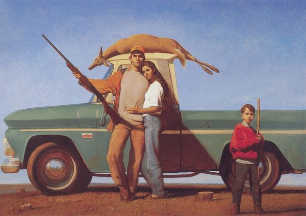 Curator: Bo Bartlett’s 2012 painting, "Radio Flyer," is a captivating scene rendered in oil on canvas. It immediately strikes me with its careful composition; the red of the wagon, pulled by a figure largely out of frame, sharply contrasts with the muted earth tones of the landscape. Editor: The figure is positioned as "other" while the young girl in the wagon appears passively present. What narratives can be decoded from this work regarding visibility, absence, and gender roles in a pictorial space that mirrors so many oppressive power dynamics? Curator: Indeed, Bartlett masterfully balances light and shadow to draw the eye directly to the girl in the wagon. The impasto technique brings the iconic red wagon forward, literally and figuratively, adding depth to this otherwise smoothly finished work. Semiotically, it is her gaze and not her positioning that holds agency. Editor: Agreed; yet in what ways does it interrogate and/or disrupt societal perceptions regarding the cultural and sociopolitical context surrounding representations of idealized Americana? Or consider a deeper psychoanalytic read... Curator: It invites many layered readings, wouldn't you say? From the brushstrokes to the subdued palette contrasted with bold red, the execution mirrors an intriguing tension. This adds complexity to Bartlett’s style and invites the viewer to ponder not just *what* is being represented, but *how.* Editor: It is necessary, however, to push past an aesthetics-driven reading that considers primarily its painterly qualities—to recognize also its potentially problematic implications and inherent assumptions about a world free from difference. How do these works engage critically with—or inadvertently reinforce—structures of dominance and marginalization? Curator: That tension—between what we *see* immediately and the layers beneath, offers something for every viewer to discover. Thanks for your perspective; I appreciate it! Editor: And I value yours, in highlighting not just the content of this work, but a fuller context to ignite richer dialogues for us to engage with and understand moving forward.