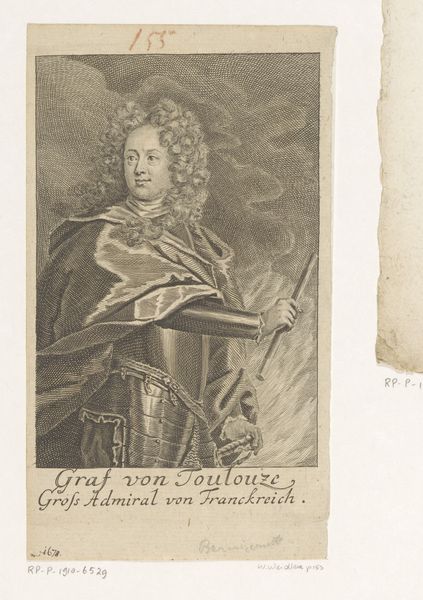 Editor: This is a portrait of John Churchill, the first Duke of Marlborough, made in 1703 by Martin Bernigeroth. It’s a print, an engraving actually. I find it very striking; it has a powerful sense of Baroque formality. How do you interpret this work? Curator: This portrait acts as a carefully constructed emblem of power. What feelings does the figure’s armour evoke? It suggests invincibility and authority. This imagery wasn't randomly chosen, it speaks volumes. Editor: I see the armour, of course, and the baton. But it’s also interesting how the Duke is rendered; the curls of his wig, the softness of his face… it almost seems to clash with the militaristic imagery. Curator: Precisely. Think of the Baroque period itself – a tension between grandeur and human emotion, control and theatricality. His physical appearance becomes part of the spectacle of power. He doesn't simply wear the symbols; he embodies them. It speaks to a specific cultural ideal, a blend of strength and refinement that leaders of that era aspired to. Editor: So, it’s not just about documenting his appearance; it’s about creating a symbol. The baton is also visually aligned with his gaze; he seems to look directly at the direction where it points to, and with resolve. I did not catch that on a first look. Curator: Absolutely. Notice the use of text underneath, its integration as part of the image itself. That lettering contributes to the visual rhetoric, declaring his identity and authority, reinforcing the intended message. Editor: It’s amazing to think about how many layers of meaning are packed into this single image. Curator: Indeed. It reminds us that portraits can act as powerful mirrors, reflecting not just appearances, but entire cultural landscapes.