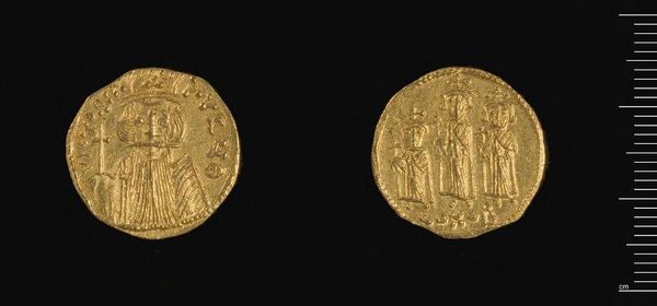 Editor: This is a Solidus of Justin I and Justinian I from Constantinople. The detail is impressive for such a small, golden object. What strikes you about its composition? Curator: The bilateral symmetry of the emperors enthroned—the mirroring of their figures, their garb, their posture—suggests a rigid, formalized power structure. Notice the careful balance of the inscriptions, framing the figures, reinforcing this sense of order. Editor: So, the coin's design reinforces the idea of imperial authority through visual symmetry? Curator: Precisely. Observe how the circular format itself contributes to a sense of completeness and containment, further emphasizing the self-contained nature of imperial power. The medium becomes a message. Editor: I hadn't considered the circle's role! It's fascinating how the design elements work together. Curator: Indeed. It’s through such formal elements that the coin transcends its mere function and speaks volumes about its intended message.