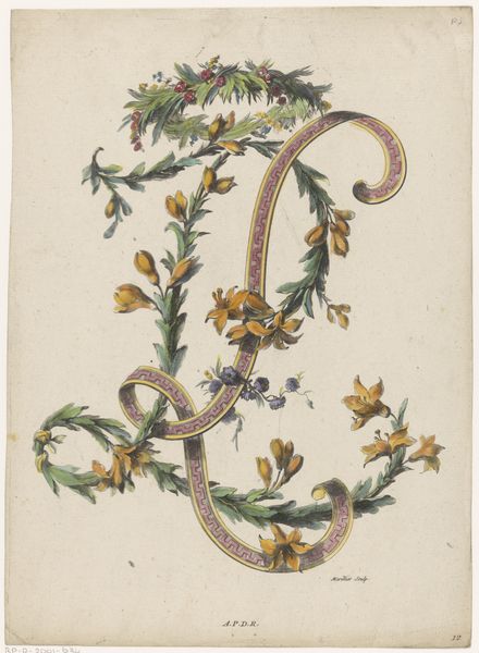 Editor: This watercolor artwork is titled "Vlechtwerk met bloemen" or "Plaited Work with Flowers," created by Lambertus Hardenberg, sometime between 1754 and 1819. I'm struck by the intricate pattern and the contrast between the delicate flowers and the bolder, almost metallic, flourishes. How would you interpret the composition of this work? Curator: Let us focus on the sinuous lines that dominate the composition. Note how they divide the pictorial space. Do you perceive how each floral element nests comfortably within the woven framework? This reinforces a calculated structure rather than pure representation. Editor: Yes, I see how the curves of the 'vlechtwerk', the plaiting, act as both container and framework. It seems very intentional. It's not just decorative; it's creating a formal order. What about the medium? Curator: The watercolor technique deserves careful consideration. The diluted pigments create gradations, emphasizing line quality and tonal transitions. Observe how the artist used washes and thin lines to simulate highlights, almost tricking the eye into believing in three dimensions. Consider the implications of ' Rococo '. Does this pattern invite closer scrutiny? Editor: It certainly does, drawing attention to both the grand, sweeping curves and the delicate floral details within. The colour palette helps, too. But if it isn’t directly representative of something, does it point to something else through its design choices? Curator: Semiotically, consider what floral motifs conveyed in that epoch. Flowers, due to their inherent natural temporality, serve as potent symbols related to fragility. How might this juxtapose with the seeming stability implied by weaving? Editor: Interesting, a formal approach brings out subtleties of colour, line, and construction that create such an engaging work! Curator: Indeed. Dissecting these constituent components has deepened my own perception of the work's symbolic tension.
