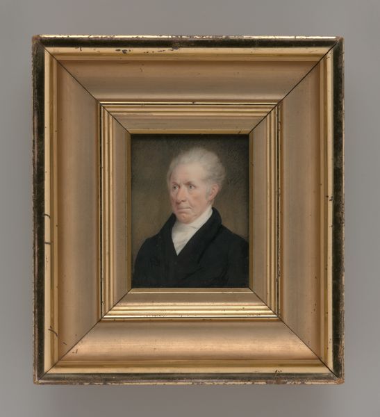 Editor: This elegant portrait, "Amtmand, geheimeråd Antoine de la Calmette" was painted between 1760 and 1802 by Jens Juel. It's an oil on canvas. I'm really struck by the artist's handling of light. It seems to almost glow from within. What stands out to you about this work? Curator: Precisely, that luminescence is quite striking. Note how Juel employs a limited palette. The somber black coat sharply contrasts with the stark white of the wig and jabot. Consider the oval format, how does this impact the composition? Editor: It focuses your attention, doesn't it? The soft curve is almost womb-like, sheltering the sitter. And that very simple background makes the gilded frame become a critical compositional element in the painting. Curator: A shrewd observation! The frame serves not merely as a border but an integral part of the visual equation, enhancing the subject’s presence. Reflect upon the subject's gaze. Where is he looking? Editor: He's looking slightly to the side, beyond the viewer, with a really direct and knowing expression. What does the turn of his head suggest? Curator: Exactly! This is a pivotal formal decision. It generates a dynamic tension, a movement that transcends the static nature of portraiture. It invites further inquiry and implicates the viewer into relationship, creating, I daresay, an emotional landscape, which can further be developed or deconstructed. Editor: That’s so interesting – seeing the way the artist's decisions about the light, framing, and pose all build to create meaning! Thank you. Curator: My pleasure. Indeed, a deeper analysis allows us to see a painting is more than mere likeness but a symphony of intention and execution.