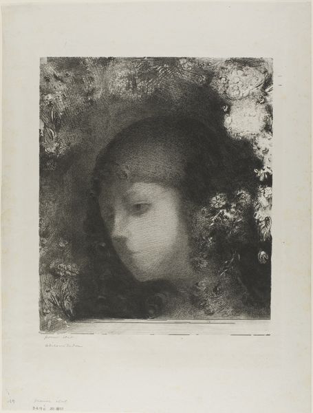 Editor: So this is "Head of a Girl," an etching by Matthijs Maris, dating from around 1881 to 1884. It’s a rather haunting image, wouldn’t you say? All those hazy lines… what’s your interpretation? Curator: It speaks to me of memory itself, the way our minds hold onto faces and figures, not as concrete realities but as shimmering, nebulous impressions. Do you notice how the background seems to melt into the subject? Editor: I do. It’s like she's emerging from a fog. Curator: Precisely. And that fog, that blurring, is crucial. Consider the pre-Raphaelite interest in depicting dreams and the ephemeral, blending visible reality with internal states. Maris was deeply influenced by that, yet he takes it a step further. Instead of sharp detail, he offers suggestion. Editor: So the vagueness is intentional, part of the message? Curator: Absolutely. It reminds us that memory is not a perfect record. Maris captures that emotional weight we assign to faces we recall. Look at how the light falls – or rather, doesn't fall – creating an almost otherworldly glow around her. Have you noticed anything familiar in her gaze? Editor: I find it kind of sad and melancholic, honestly. It’s like she’s lost something. Curator: Perhaps. Or perhaps she represents a universal archetype – the lost innocence, the fading beauty. Maris's use of etching, that almost scratchy quality, reinforces that sense of fragility. The piece reminds me of the human condition – enduring yet fleeting. What do you make of this choice of form? Editor: Thinking about it, etching gives it an immediacy that fits that feeling. Something sketched quickly from life but holding something deeper. I hadn't quite put that together before! Curator: Indeed. The etching technique itself embodies that fragility and immediacy, doesn’t it? Every scratch tells a story of fleeting moments. Editor: I see it now. I initially saw it as just a portrait but now realize there is way more symbolism than first meets the eye. Thanks so much!