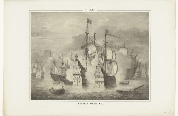 Editor: This is "Bombardement van Algiers, 1816," an engraving by Albertus Anthonius Nunnink made sometime between 1853 and 1855. There's such dramatic intensity in the scene despite the monochromatic palette. What does this work say about how the Netherlands viewed warfare and naval power at the time? Curator: That's an astute observation. Think about this print as both a historical document and a piece of propaganda. While the depicted event—the Bombardment of Algiers in 1816—aimed to suppress piracy and free Christian slaves, it was also a display of British and Dutch naval might. How might the public at the time have received such an image? Editor: Perhaps with a mix of pride and anxiety? Pride in the nation's strength, but maybe anxiety about the cost of maintaining such power and engaging in these conflicts. Curator: Exactly. These prints were often commissioned by governments or wealthy patrons to shape public opinion. Consider the composition itself: the orderly arrangement of the ships, the billowing smoke lending drama, yet the scene feels somewhat controlled. Doesn’t that project an image of calculated power, not chaotic violence? How does it compare to, say, contemporary depictions of land battles? Editor: Land battles tend to be depicted more chaotically, from what I've seen, emphasizing the brutal hand-to-hand combat and the human cost. This image really does present a sanitized, almost glorified version of naval warfare. Curator: And that glorification serves a purpose. It reinforces the narrative of the Netherlands as a powerful, righteous force on the world stage, masking the complexities and brutalities of colonialism. So, in studying this print, we must ask: who is telling this story, and what are they trying to achieve? Editor: This has really opened my eyes to considering how political agendas influence historical art. Thank you! Curator: My pleasure. Remembering the social context helps us unlock richer meanings within even seemingly straightforward depictions of events.