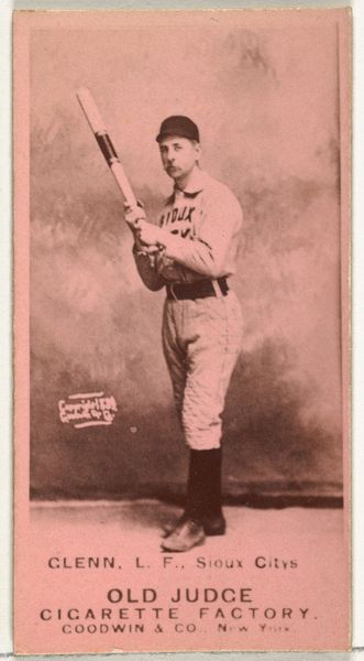 Editor: Here we have a card from the "Old Judge" series for Old Judge Cigarettes, dated 1889. It depicts James J. "Sun" Daly, a left fielder for Minneapolis. What immediately strikes me is the promotional nature of it. How does that affect its status as a work of art, or an object of historical importance? Curator: That's a great question. Its original context is paramount. These cards weren't intended as high art; they were marketing tools, inserted into cigarette packs to boost sales. However, that commercial aspect doesn't negate its value. It reflects a moment in social and cultural history, when baseball's popularity was soaring and advertising was becoming increasingly sophisticated. Editor: So the advertisting makes the picture "relevant"? Curator: Exactly. These cards served multiple purposes. They promoted baseball and individual players, and created brand loyalty for "Old Judge Cigarettes." They reflect the public’s increasing engagement with mass media and the burgeoning cult of celebrity around athletes. How do you see the player's image itself, within that promotional context? Editor: It seems like a very posed, almost theatrical representation, rather than a candid snapshot. Is that typical for photography of this period? Curator: Yes, staging was common, because photographic technology demanded longer exposure times. Also consider the way baseball is being represented and romanticized to its public at this early stage in its rise to popularity, Editor: That’s fascinating. I’d always thought of photographs as inherently "real," but this really challenges that notion. Curator: And it's precisely that tension between "real" and constructed that makes this piece so compelling. The commercial use helps us see the cultural values at the time. Editor: I learned a lot from considering how it functioned in its own historical moment, as advertisement and a snapshot of early baseball culture. Curator: Likewise, considering the role of art as it interacts with developing commercial opportunities really underlines the socio-political value of it as a whole.