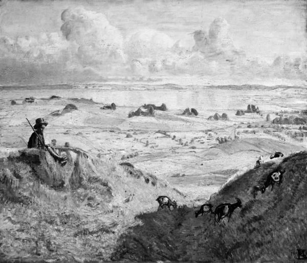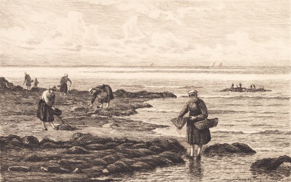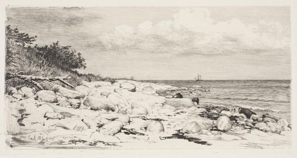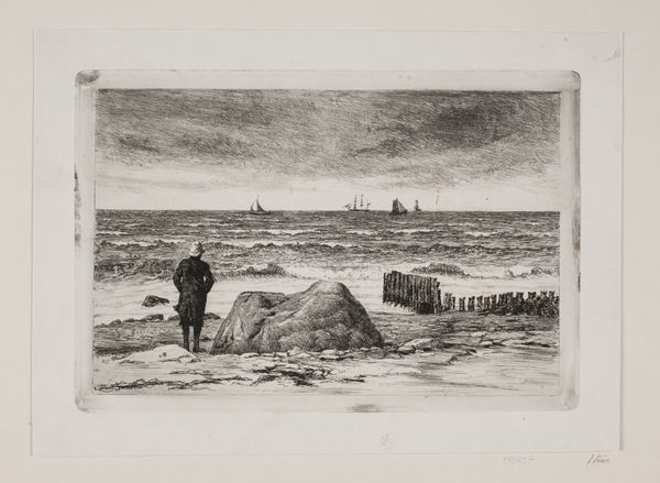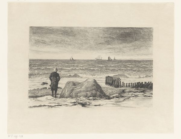 Editor: We’re looking at "Windy Weather," a charcoal drawing by Carl Bloch from 1885. The scene is of a lone figure staring out at a turbulent sea. I'm really struck by the sketch's sense of isolation and the immensity of nature. What stands out to you in this piece? Curator: It’s a beautiful example of how artists engage with Romanticism’s themes of the sublime, filtered through the lens of 19th-century social realities. Consider the figure: their attire hints at a certain social standing, a middle-class observer perhaps. The “windy weather” isn’t just a meteorological phenomenon; it’s a symbol of the turbulent social climate, of a world changing due to industrialization and colonization. Do you see the ships on the horizon? Editor: Yes, there are several. They're quite small against the expanse of the ocean. Curator: Precisely. Those ships are critical; they're carriers of goods, people, and power. Bloch positions this individual, and therefore the viewer, as someone distanced from that activity, an observer on the margins of a rapidly changing world. It speaks to the position of the artist, and of art itself, as both implicated in and separate from those power structures. Do you think Bloch intends to be critical of this system, or is he just portraying reality? Editor: That's a good question. The isolation seems critical, almost mournful. It seems like a critique of the effects of that industrialization and those power structures, yes. Curator: The fact that this is a drawing, not a painting also shapes our perception of it. The immediacy and seeming spontaneity of the medium might signal an unmediated response to a particular socio-political condition. Bloch is not just representing the natural world; he's commenting on a society grappling with massive change. Editor: That really shifts my perspective. I was just seeing a lonely guy at the beach. Now it feels much more complex and politically charged. Curator: Exactly! Art provides an entry point to explore history.