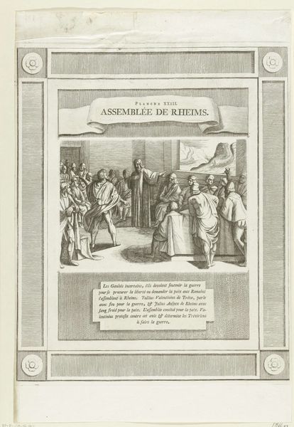 This print, titled "Geheime ontmoeting van Civilis met leiders van de Teviri, 69-70," was made by an anonymous artist, likely around that period. Notice how the artist uses a structured, almost architectural framing device to contain two distinct spatial realms. To the left, a flurry of figures in an outdoor, military setting contrasts sharply with the right side, which depicts an interior space with a gathering of what appears to be officials. The use of line is meticulous, creating a sense of depth and hierarchy within the composition. The figures are meticulously rendered, each line contributing to the texture of their garments and the overall scene. This division between the public, chaotic military sphere and the enclosed, ordered council room suggests a duality in power and decision-making. The print's structure seems to comment on the relationship between leadership and its execution, challenging fixed notions of authority and control. This artwork invites us to consider how power is negotiated, represented, and ultimately, destabilized through visual form.