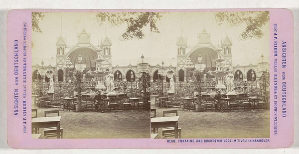 Curator: This photograph, entitled "Gelegenheidsbouwwerken in Hannover," was taken by Georg Reese between 1869 and 1890. It appears to be a view of an exhibition or fairground. Editor: My immediate impression is one of constructed grandeur. The elaborate architectural details contrast starkly with the seemingly ad-hoc arrangement of chairs and tables in the foreground. It feels… staged, almost artificially inviting. Curator: Indeed. Notice the repetitive use of arches and the almost obsessive symmetry in the main building's facade. Reese uses linear perspective masterfully, drawing the viewer’s eye toward a vanishing point that reinforces the order and control inherent in the structure. The carefully positioned statues punctuating the courtyard further amplify this effect, don’t you agree? Editor: Absolutely, but I'm also struck by the material paradox. These buildings, likely temporary, were built to convey a sense of permanence through elaborate construction. I wonder about the labor and materials involved in erecting such a display for a fleeting moment. Consider the trees in planters: objects moved in and out to create an enticing presentation! Curator: Precisely! The tension lies in the deliberate artistry employed in creating an ephemeral reality. Think of the implications concerning social values assigned to art and display versus the real economic factors of transient spectacle. Editor: Yes, it also hints at consumption and the performative nature of public space, and even more important how constructed that appearance is. All these objects have been brought in to convey an emotion that someone is expecting or willing to buy. This is reinforced through how neatly it's organized and composed in an ordered frame and light Curator: Very insightful. What resonates most with me is the visual choreography—the meticulously planned distribution of architectural elements working together to produce a very deliberate ideological experience for the visitors. It's pure visual rhetoric, framing and reinforcing concepts of progress, industry, and perhaps national identity through form alone. Editor: Ultimately, considering how art can conceal more than it reveals, examining labor and consumption unveils the temporary, curated, yet undeniably grand ambitions present in this image. Curator: A compelling reminder that structures, even ephemeral ones, embody more than meets the casual eye.