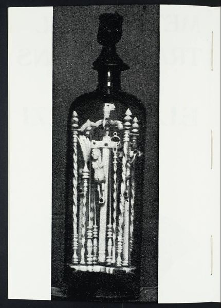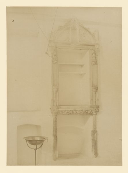 Curator: Welcome. We are looking at a photograph, an assemblage of photography and print. The piece is titled, "Scale Model of a Cooking Pot", and it's dated between 1917 and 1938. It's part of the Rijksmuseum collection. Editor: My first impression? It’s strangely captivating. The composition is so stark, the high contrast against the elaborate wallpaper makes this industrial-looking model in its display case feel oddly precious. It evokes a sense of preservation, almost like a scientific specimen. Curator: Absolutely, and consider the timing. The image dates from a period of immense social upheaval following the First World War, as well as the Interwar, and before WWII broke out. What does it mean to create, to archive, an image of domestic technology during these pivotal times? Editor: That’s fascinating. Thinking about that context, perhaps the 'cooking pot' becomes more than just a household item. It might be a symbol of stability, of nourishment, in a world grappling with scarcity and uncertainty. The display case could then be seen as a commentary on the fragile nature of domestic life, a reminder of how easily basic necessities can be disrupted by broader political and economic forces. Curator: Precisely. The photographic medium also comes into play, reflecting mass media and production, giving authority to even quotidian, "feminine" object by showcasing this thing like something important or noteworthy. Also, don't forget how museums decide what and how to archive historical documents and artworks—institutions have played an active role in promoting political and cultural powers through material selection and classification. Editor: And to further that point about feminine objects and the period, the idea of domestic labor becoming a sort of…monumental endeavor. In a patriarchal society that devalues domestic tasks, to memorialize a kitchen implement elevates the contributions of women. The choice of scale also plays into this; making small the large cooking devices that have a very important social function—a quiet resistance against gender inequality. Curator: A powerful and insightful reading. The object’s ordinariness is charged through this photographic display of preservation. What final thoughts do you have? Editor: I'm left wondering who chose this, and what conversation were they trying to elicit then that remains resonant even today about the relationship between our interior lives and external realities. Curator: Indeed. The history of technology presented here compels us to reconsider how history is constructed. A seemingly innocuous photo contains many political threads, if only one starts to pull.